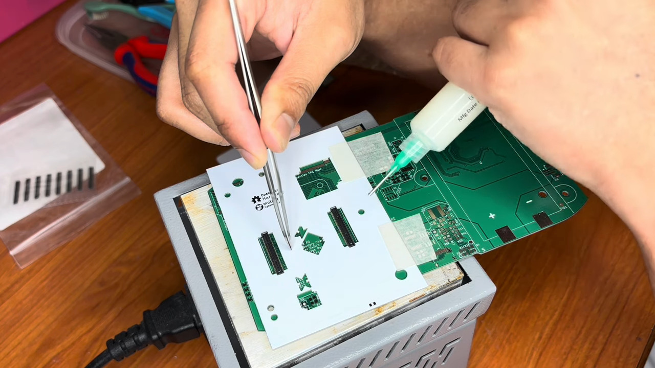 To fight this problem, [rahmanshaber] came up with this clever custom PCB fixture. The trick is to create a jig to hold the fine-pitch parts securely while still leaving room to work. In his case, the parts are a couple of SMD ribbon cable connectors and some chips in what appear to be TQFP packages. [rahmanshaber] used FreeCAD to get the outline of each part from the 3D model of his PCB, and KiCad to design the cutouts; skip to 7:30 or so in the video below if you don’t need the design lesson. The important bit is to leave enough room around the traces so that the part’s leads can rest of the PCB while still having room to access them.