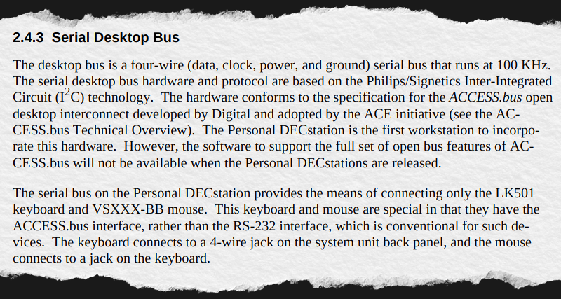 I2C is robust, simple, and cheap to implement with reasonable licensing from Philips. It just needed a little tweaking to make it suitable for peripheral use, and that was the idea behind ACCESS.bus. [Ernie] tracked down a 1991 article that covered the technology and explained a good bit of the how and why. You can also find a comparison of A.b, I2C, and SMBus in this old datasheet. You can even find the 3.0 version of the spec online. While DEC was instrumental in the standard, some of their equipment used SERIAL.bus, which was identical except for using 12 V power and having a slightly different pinout.