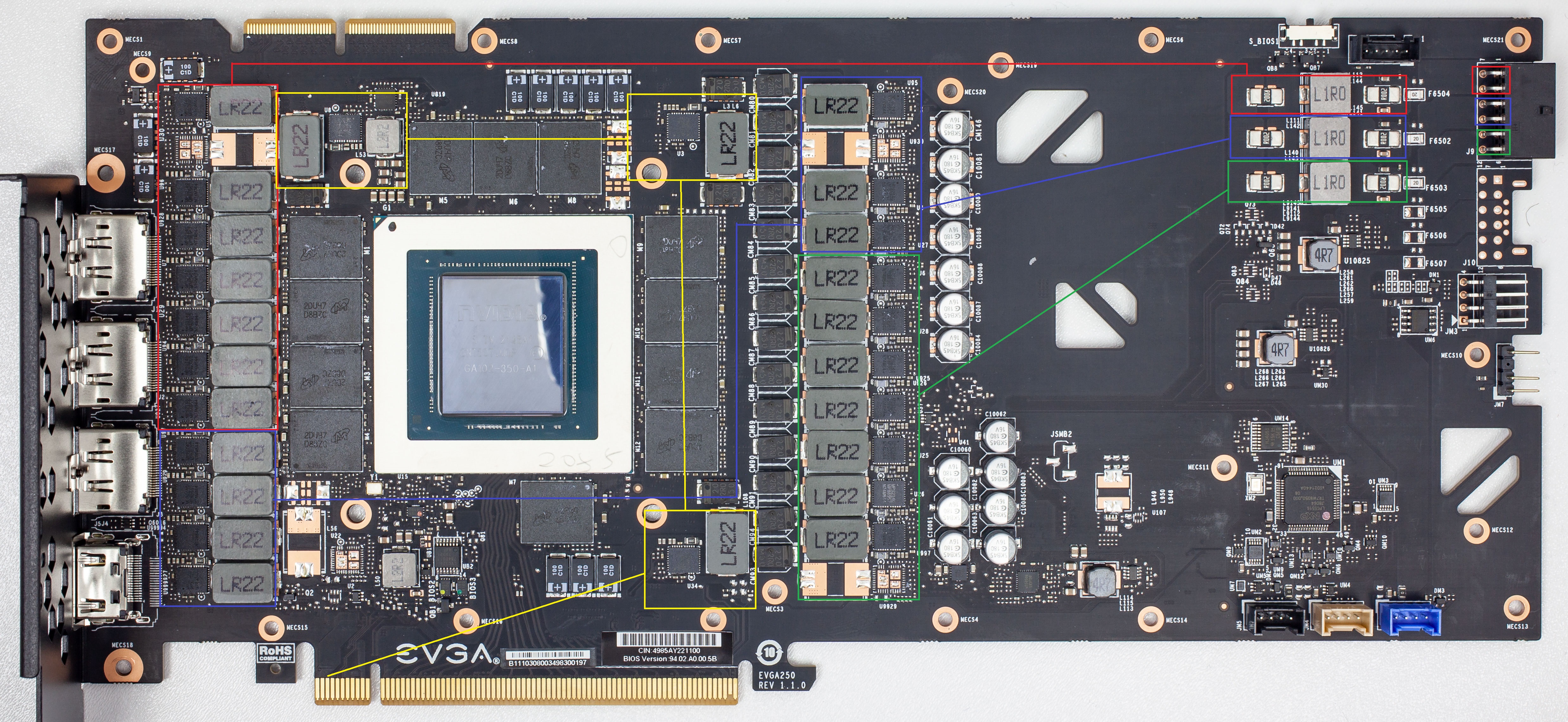 EVGA RTX 3090 Ti GPU with triple phase distribution marked. Yellow is PCIe slot power. (Credit: taka, TechPowerUp forums)