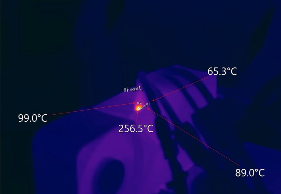 Hot spot of a 12VHPWR connector on NVidia RTX 4090 Founders Edition GPU. (Credit: Gamers Nexus, YouTube)