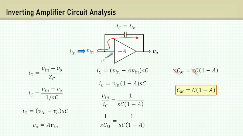 Put simply, the Miller effect — found in 1919 by [John Milton Miller] — is the change in input impedance of an inverting amplifier due to the gain’s effect on the parasitic capacitance between the amplifier’s input and output terminals. The parasitic capacitance acts like there is an additional capacitor in parallel with the parasitic capacitance that is equivalent to the parasitic capacitance multiplied by the gain. Since capacitors in parallel add, the equation for the Miller capacitance is C-AC where C is the parasitic capacitance, and A is the voltage gain (which is always negative, so you might prefer to think of this as C+|A|C.