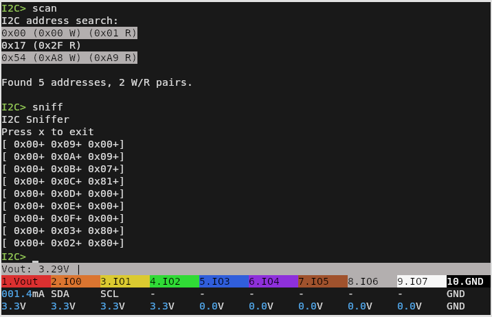 Admittedly, I2C sniffing isn’t anything you couldn’t do with a cheap logic analyzer. But that means dealing with captures and making sure the protocol decoder is setup properly, among other bits of software tedium. In comparison, once you start the sniffer program on the Bus Pirate 5, I2C data will be dumped out to the terminal in real-time for as long as you care to see it. For reverse engineering, it’s also very easy to move quickly from sniffing I2C packets to replaying or modifying them within the Bus Pirate’s interface.