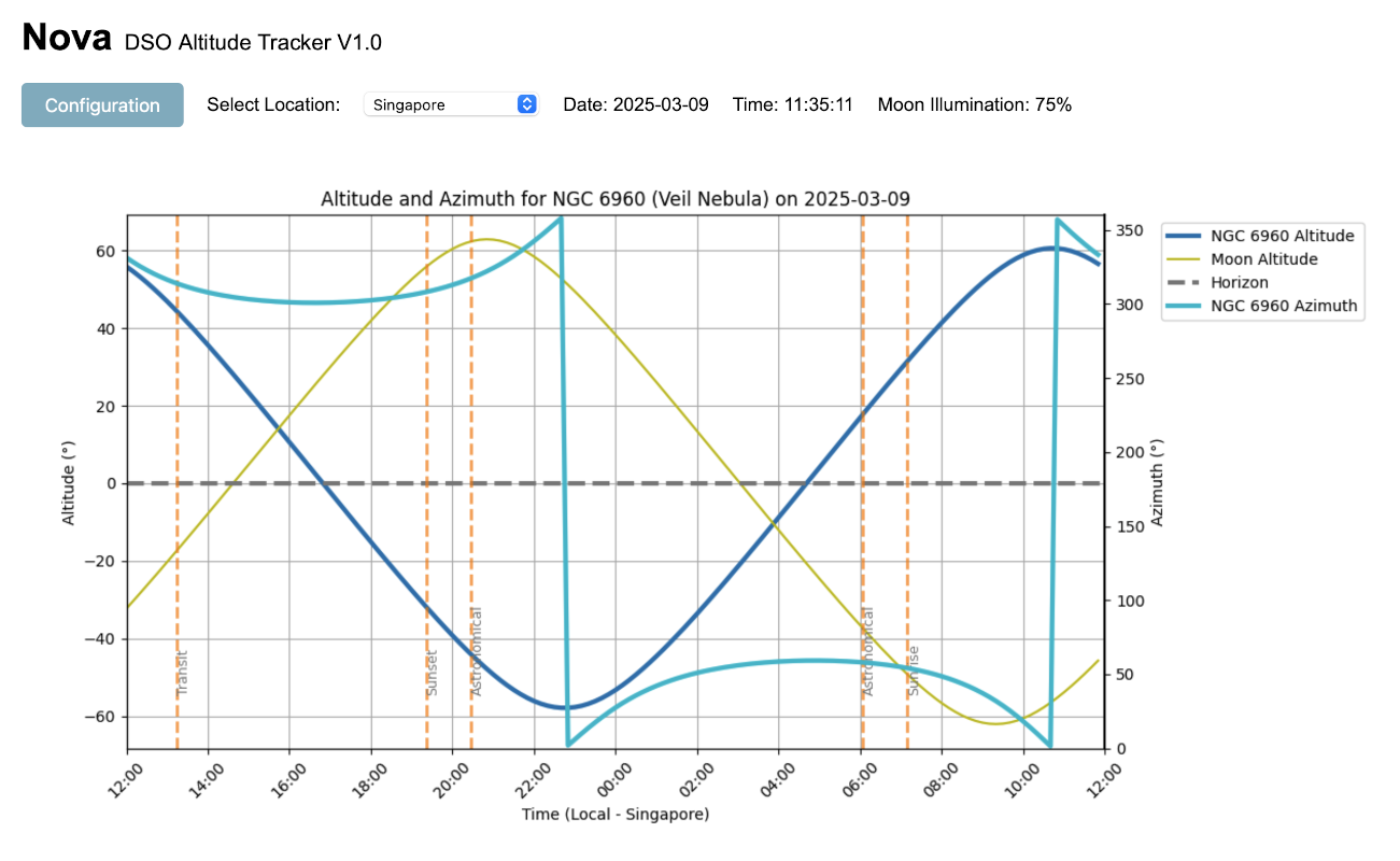[Anton] calls his tool the Nova DSO Altitude Tracker and gets its information from SIMBAD, updating every minute for a given location on the planet. With that location data, the program calculates altitude and azimuth for various objects and also helps the user keep track of other important variables like moon illumination and angle above the horizon. It also allows the user to highlight specific objects of interest, making sure they are front and center throughout the session. Each DSO can be selected from a list to display detailed information about it such as its path, time visible in the sky, and other properties.