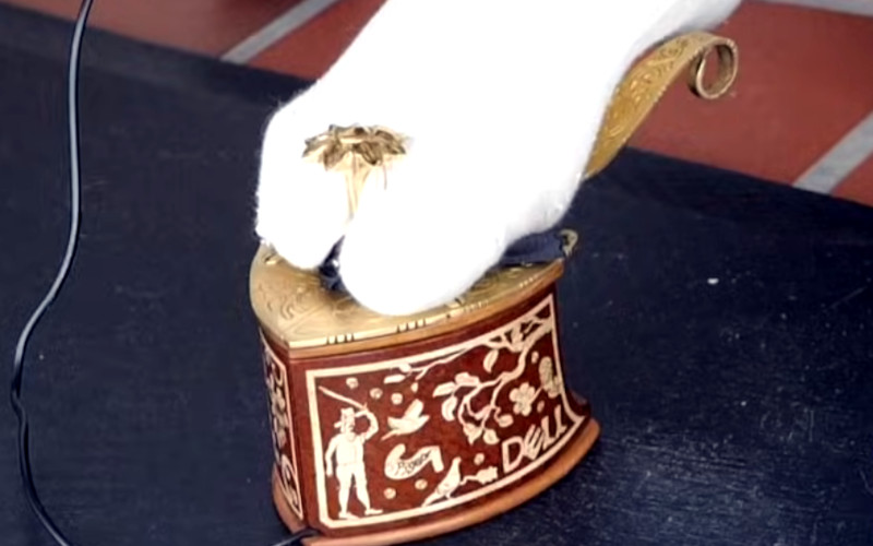 The innards of an ordinary USB mouse are placed in something best described as a wooden platform heel, upon which is placed a brass sole with a couple of sections at the front to activate the buttons with the user’s toes. The standout feature is the decoration. With engraving on the brass and inlaid marquetry on the wood, it definitely doesn’t look like any computer peripheral we’ve seen.