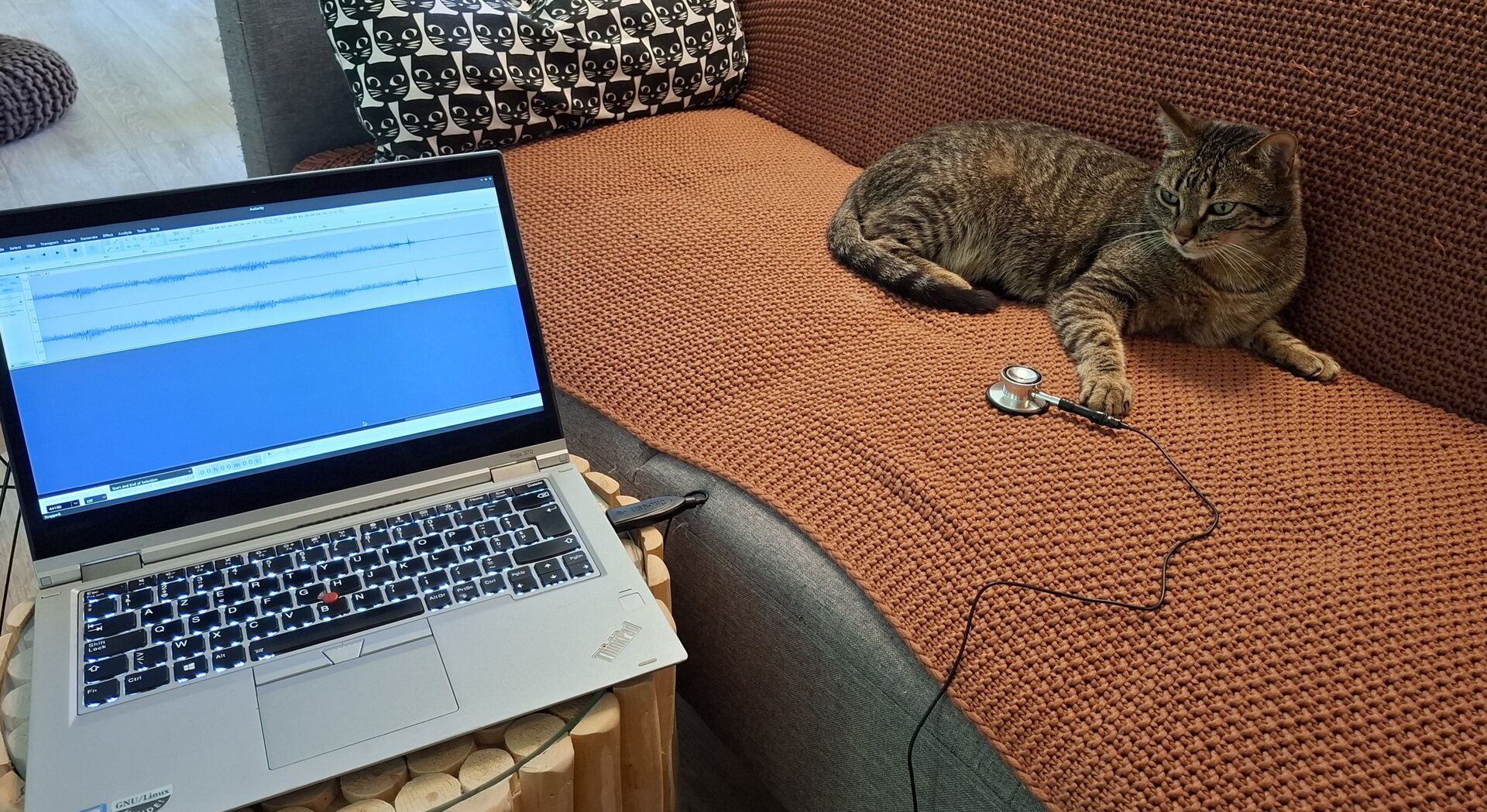Never fear; [David] makes it clear that his fur-baby [Geuloush] is fine, although the gel needed for an echocardiogram likely left the cat permanently miffed. With a normal feline heart rate in the 140s, [David] found it hard to get an accurate pulse by palpation, so he bought a cheap stethoscope and a basic lavalier USB microphone. Getting them together was as easy as cutting the silicone tubing from the stethoscope head and sticking the microphone into it.