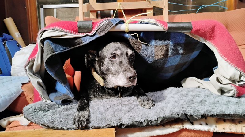 In electronics terms it’s a relatively low-tech project, using as it does a 12 volt electric lap blanket aimed at motorists. It’s none the less a hack though, because it has a frame made of PVC pipe to hold it, and a blanked clipped in place. This forms a box-like structure above the sleeping position keeping the dog very comfortable indeed over chilly nights. We’ve cared for more than one geriatric dog over the years, and can see that something like this is vital for their comfort and well-being.