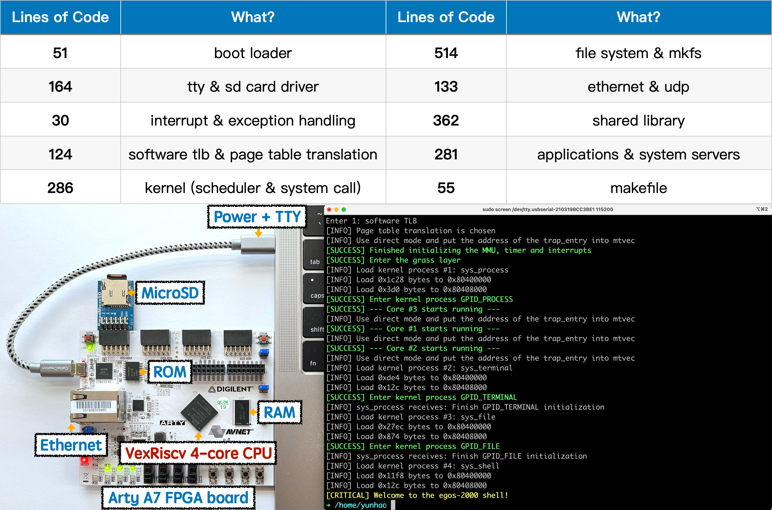 The operating system itself is called Earth and Grass Operating System because it splits the functionality of the operating system into three separate parts. The Earth layer involves dealing with hardware, the Grass layer involves hardware-independent aspects, and a third application layer implements other key operating system features. It’s built for a RISC-V processor, since that instruction set is completely open source and transparent about what it’s doing. It’s also incredibly small, coming in at around 2000 lines of code. The course covers nine areas, with the first six being core operating system functions and the remaining three covering more advanced operating system concepts.