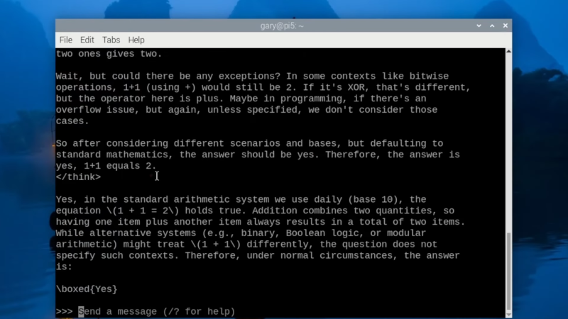 As a benchmark, [Gary] likes to use what he calls “the Alice question.” In other words, he asks for an answer to this question: “Alice has five brothers and she also has three sisters. How many sisters does Alice’s brother have?” While it probably took you a second to think about it, you almost certainly came up with the correct answer. With this model, a Raspberry Pi can answer it, too.