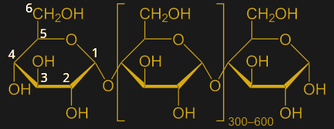 Amylose, one of the main polysaccharides in starch. The glucose subunits are connected in long, unbranched chains up to 500 or so residues long. The oxygen atom binding each glucose together comes from a reaction between the OH radicals on the 1 and 4 carbons, with one oxygen and two hydrogens leaving in the form of water.