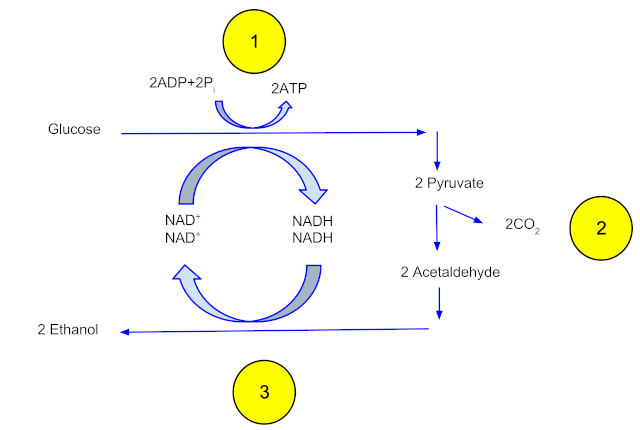 Fermentation occurs at around 30 degrees C over two to three days, while the yeast gorge themselves on the glucose-rich slurry. The glucose is transported into the yeast, where each glucose molecule is enzymatically split into two three-carbon pyruvate molecules. The pyruvates are then broken down into two molecules of acetaldehyde and two of CO2. The two acetaldehyde molecules then undergo a reduction reaction that creates two ethanol molecules. The yeast benefits from all this work by converting two molecules of ADP into two molecules of ATP, which captures the chemical energy in the glucose molecule into a form that can be used to power its metabolic processes, including making more yeast to take advantage of the bounty of glucose.