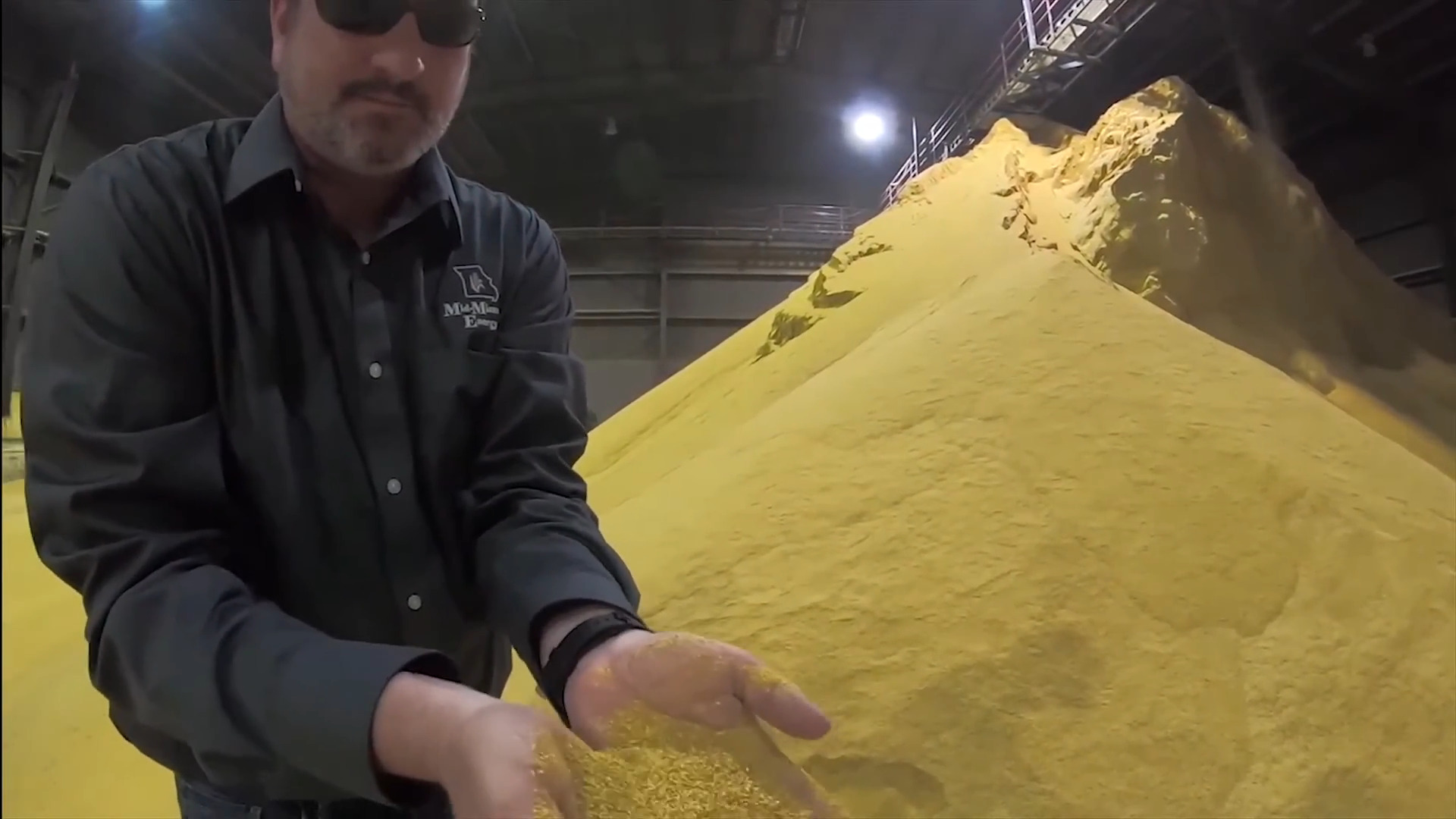 Ethanol fermentation produces mountains of DDGS, or dried distiller’s grain solubles. This valuable byproduct can account for 20% of an ethanol plant’s income. Source: Inside an Ethanol Plant (YouTube).