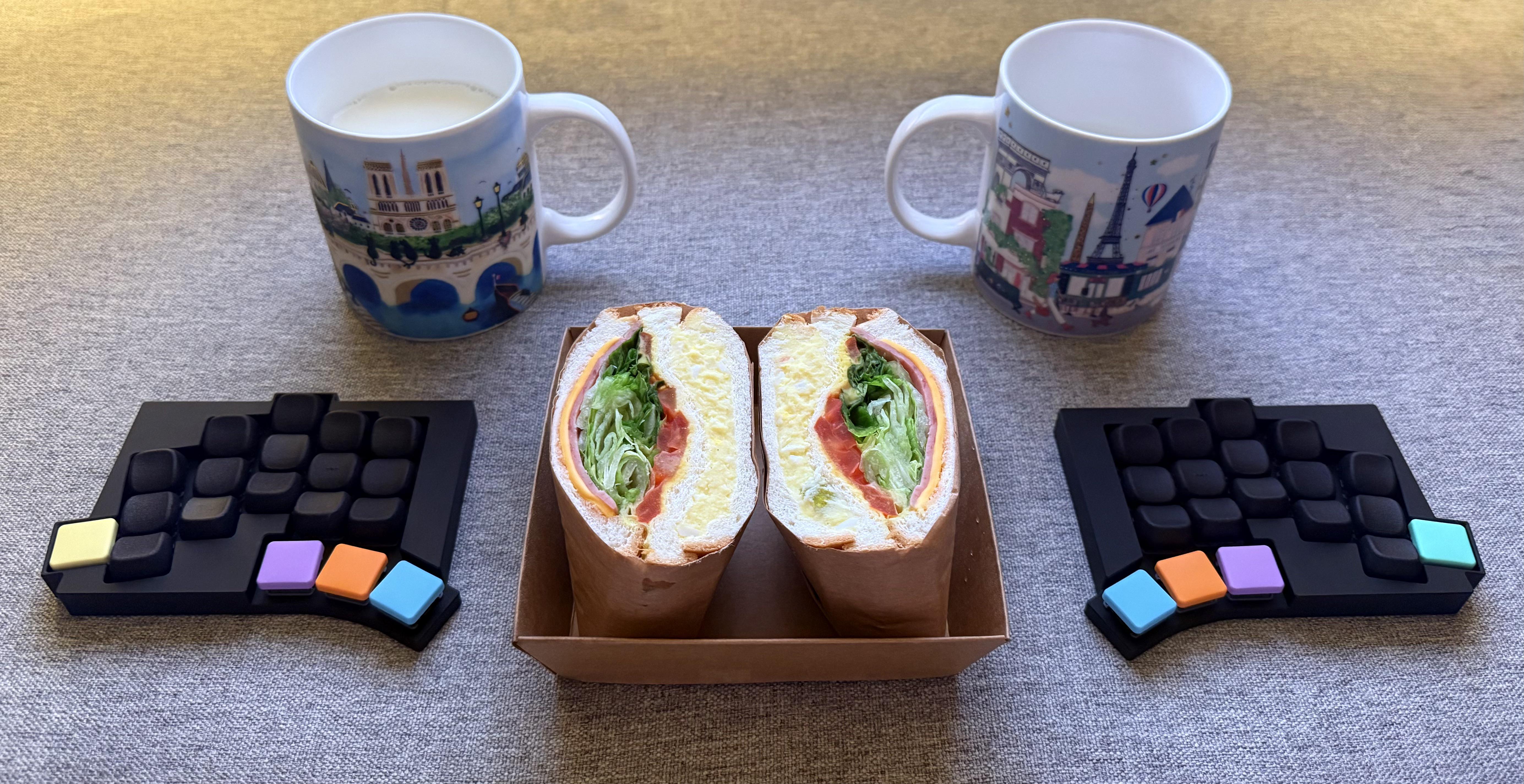 Again, very little detail to go off of here, but the keyboard is a totem. Couldn’t even tell you what’s in the right hand (left hand, if you go by the handle orientation) mug. Water, I suppose. But being a two-fisted drinker myself, I can really appreciate this setup, And although the sammy isn’t really my type, the extreme tenting on it is a nice touch.