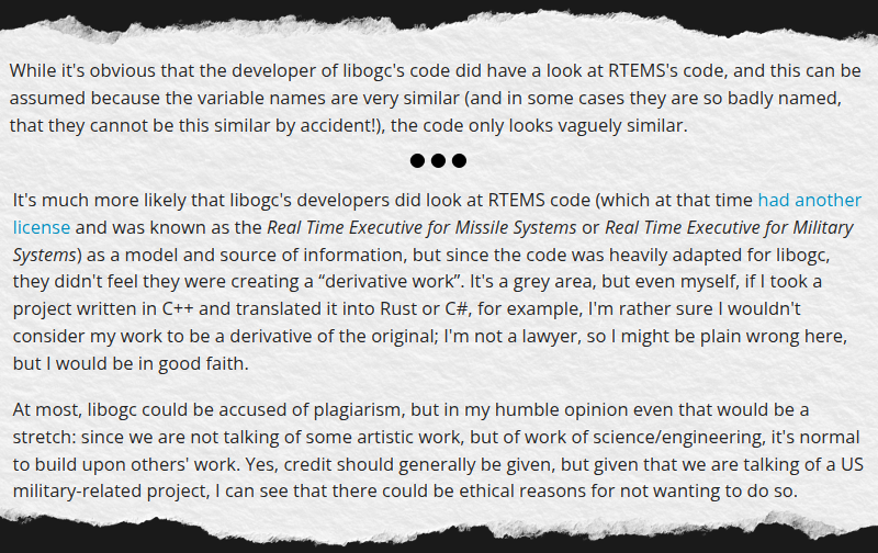 But that doesn’t mean there isn’t merit to some of his claims. At least part of the debate could be settled by simply acknowledging that RTEMS was an inspiration for libogc in the library’s code or documentation. The fact that the developers seem reluctant to make this concession in light of the evidence is troubling. If not an outright license violation, it’s at least a clear disregard for the courtesy and norms of the open source community.