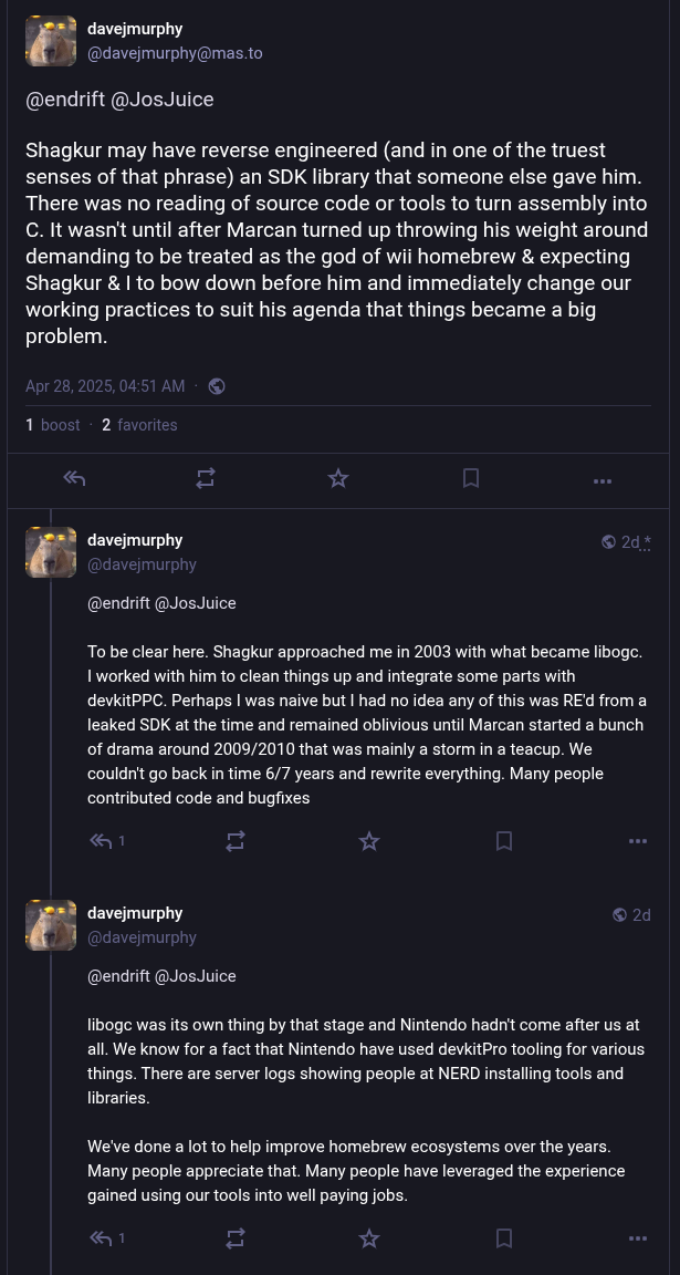 In posts to Mastodon, Murphy acknowledges that some of the code may have been produced by reverse engineering parts of the official Nintendo SDK, but then goes on to say that “There was no reading of source code or tools to turn assembly into C”.