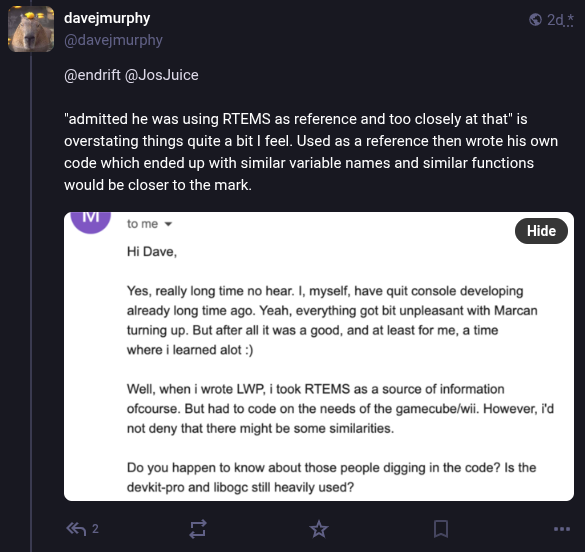 The most detailed comes from Alberto Mardegan, a relatively new contributor to libogc. While the code in question was added before his time with the project, he directly addresses the claim that functions were lifted from RTEMS in a blog post from April 28th. While he defends the libogc developers against the accusations of outright code theft, his conclusions are not exactly a ringing endorsement for how the situation was handled: