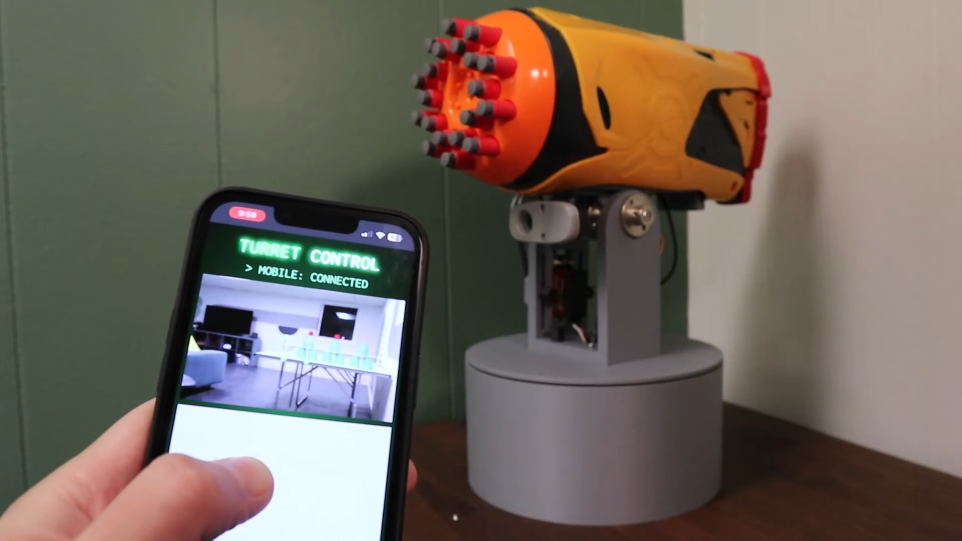 For this build, the Nerf blaster was slimmed down and fitted to a turret base built with hobby servos and 3D printed components. The blaster is also fitted with a webcam for remote viewing. A Raspberry Pi is running the show, serving up a video feed and allowing aiming commands to be sent via a Websockets-based interface. Thus, you can login via a web browser on your phone or laptop, and fire away at targets to your heart’s content.