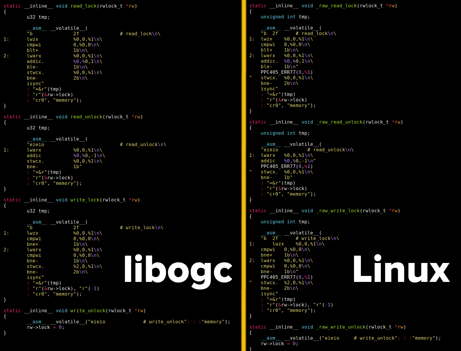 So the question of whether or not libogc uses Linux code is going to be critical to determining how the project moves forward. The RTEMS statement doesn’t go into great detail about this claim, simply stating that the “spinlock implementation is copied directly from Linux circa 2.4 or 2.6 release series.” Sure enough, when comparing the file spinlock.h file from the latest version of libogc to linux-2.6.0/include/asm-ppc/spinlock.h there are indeed functions which are nearly identical: