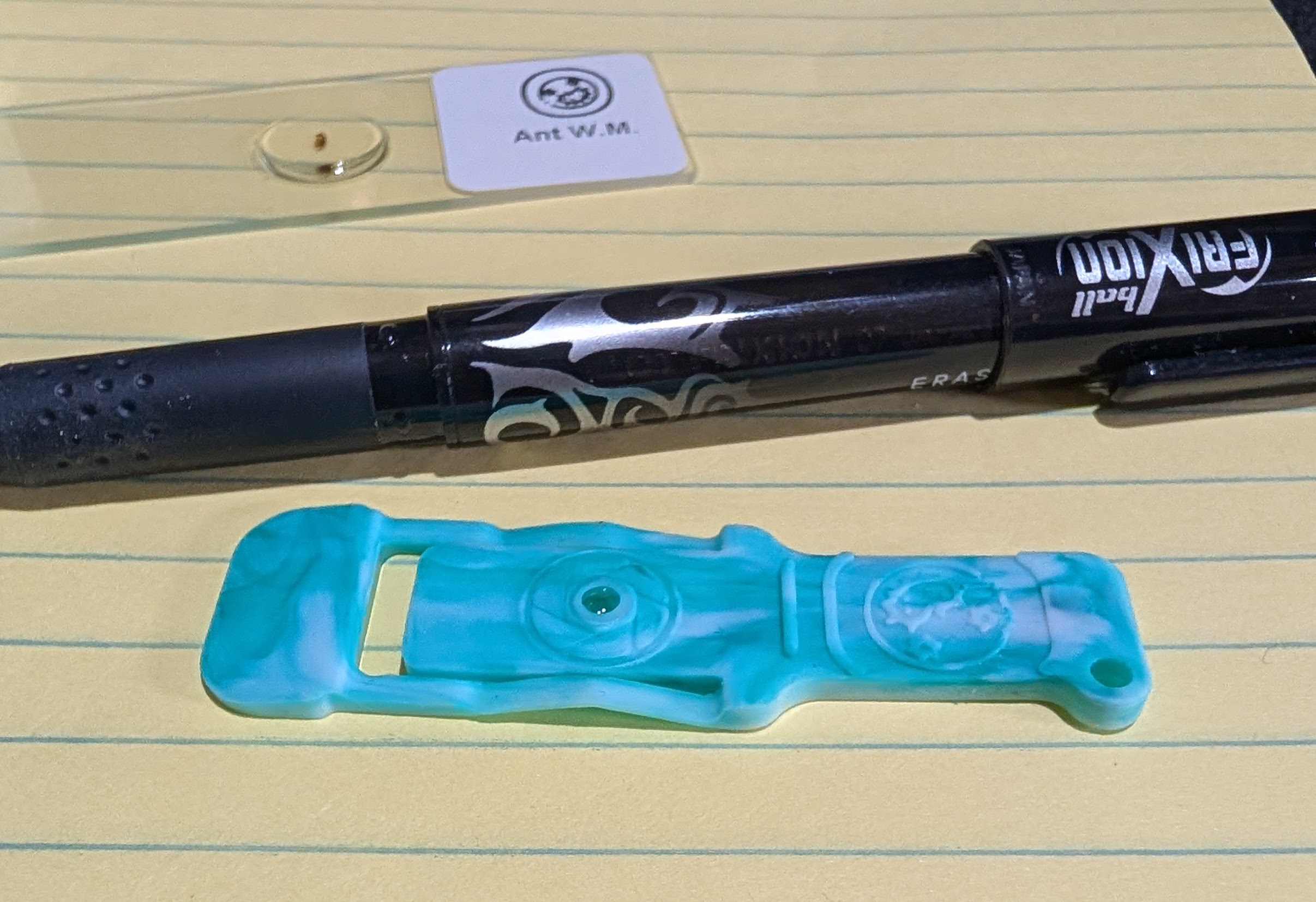 The whole thing is in an unassuming Altoids-like tin. Inside the box are mostly accessories you may or may not need, like a lens cloth, a keychain, plastic pipettes, and the like. There are only three really interesting things: A strip of silicone with a glass ball in it, and a slide container with five glass slides, three of which have something already on them. There’s also a spare glass ball (the lens).