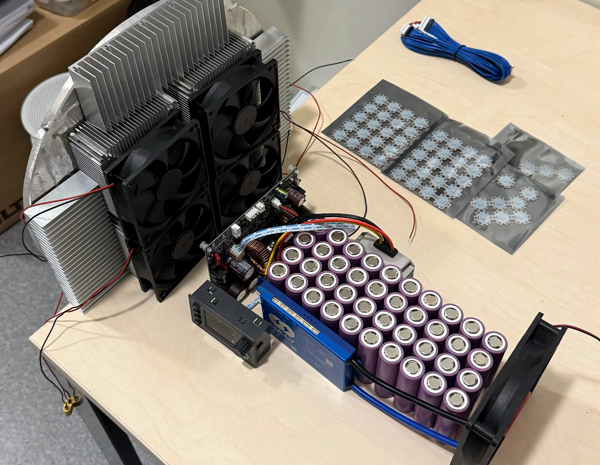 This spotlight is made from 48 white LEDs, wired in 16S3P configuration, and is powered by a similarly beefy 20S2P battery pack. That 1.2 kW power draw generates a lot of heat which is dissipated with an array of heat sinks and five cooling fans. Total cost was in the order of $2,000 USD.