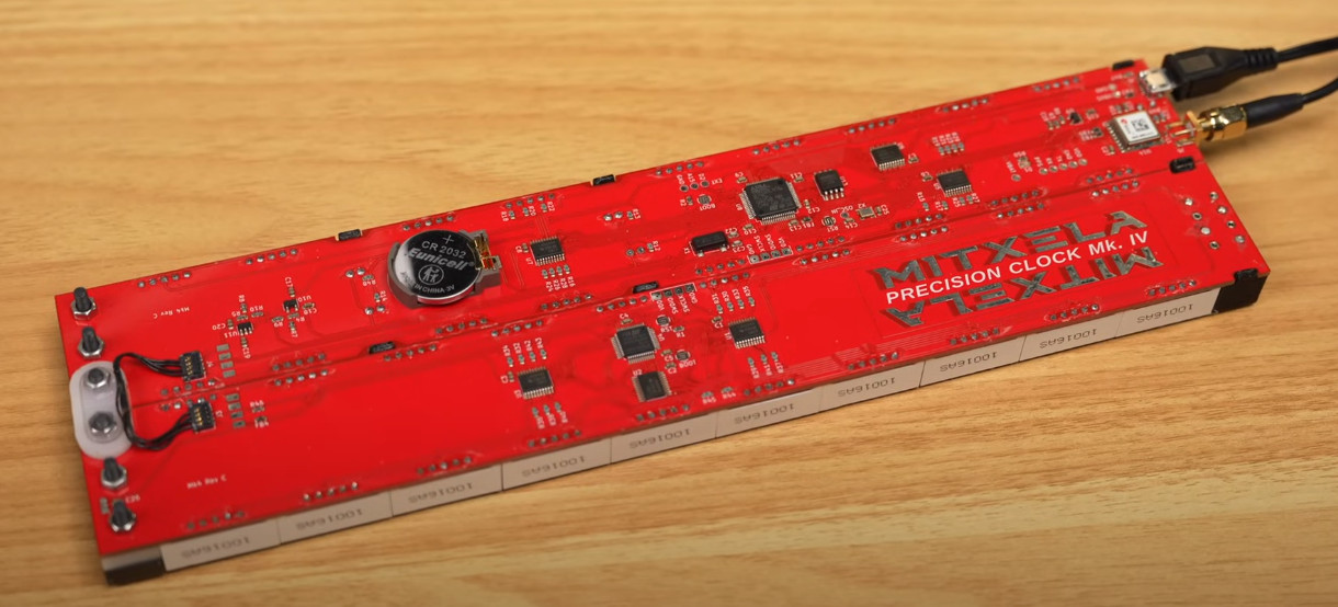 Over on his secondary YouTube channel, [Jeff Geerling] recently demoed the new Mitxela Precision Clock Mk IV.