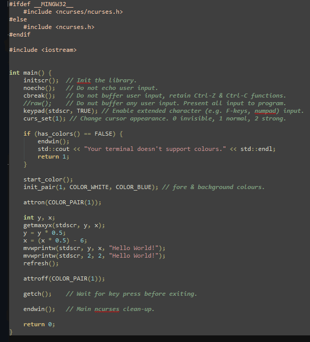 Finally, we turn the color attribute back off and wait for a keypress with getch() before cleaning up with endwin(). This code is also available along with a Makefile to build it in this GitHub repository as hello_ncurses.cpp. Note that on Windows (MSYS2) the include path for the ncurses header is different, and you have to compile with the -DNCURSES_STATIC define to be able to link.
