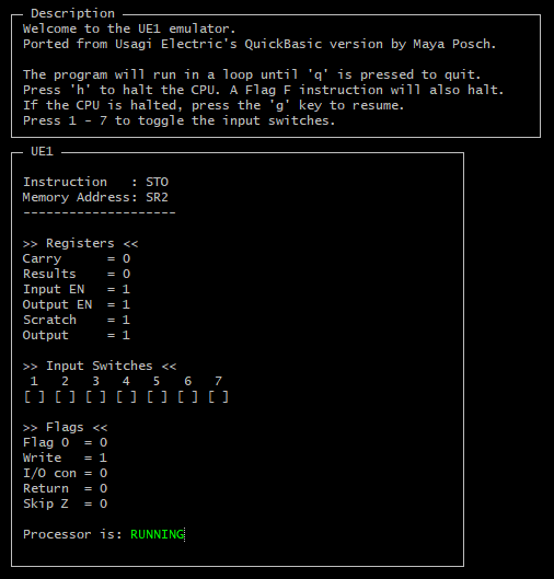Using David’s QuickBasic-based version as the basis, I wrote a C++ port that differs from the QB version in that there’s no single large loop, but rather a separate CPU (processor.cpp) thread that processes the instructions, while the front-end (ue1_emu.cpp) contains the user input processing loop as well as the ncurses-specific functionality. This helps to keep the processor core’s code as generic as possible. Handling command line flags and arguments is taken care of by another project of mine: Sarge.