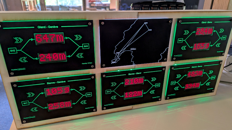 Sometimes a project forms itself around a component rather than an idea, and thus it was that [Maximilien] found himself building a data rate monitor for the connection between two data centers. Some MD0657C2-R LED dot matrix displays for not a lot needed a project.