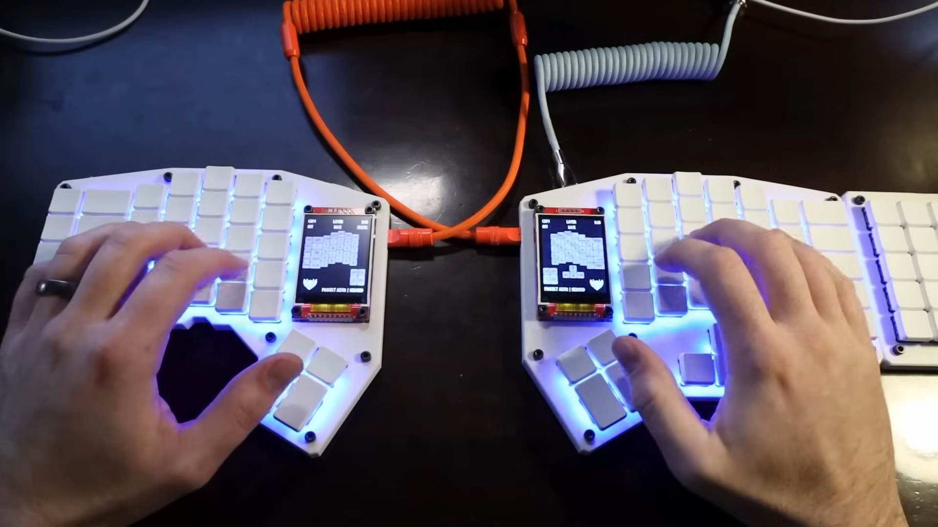 The first thing you’ll note is the split design, which allows each half of the keyboard to be placed optimally for each arm’s comfort. They’re linked with a cable, which allows the STM32 microcontroller to read the keys on both sides and then spit out the right stuff upstream over its USB-C connection. The microcontroller is also in charge of running the per-key LED lighting and the LCD screens on each half.