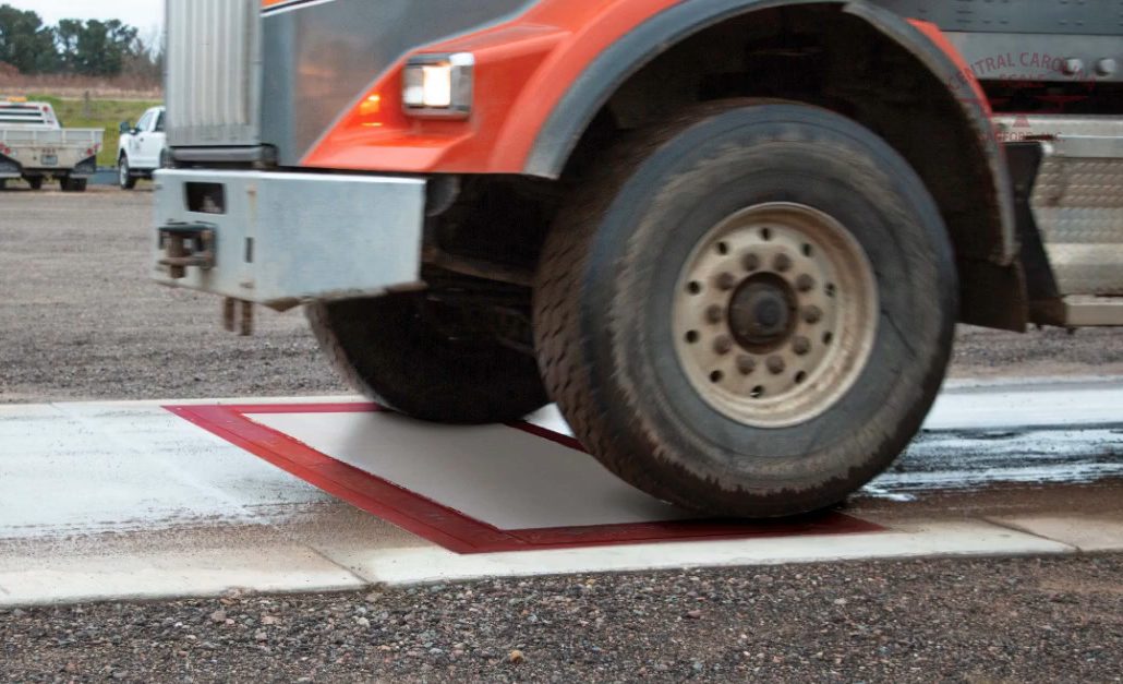 Another advantage of WIM systems is that the spacing between axles can be measured. The speed of the truck through the scale can be measured, usually using a pair of inductive loops embedded in the roadway around the WIM sensors. Knowing the vehicle’s speed through the scale allows the scale controller to calculate the distance between axles. Some states strictly regulate the distance between a trailer’s kingpin, which is where it attaches to the tractor, and the trailer’s first axle. Trailers that are not in compliance can be flagged and directed to a parking area to await a service truck to come by to adjust the spacing of the trailer bogie.