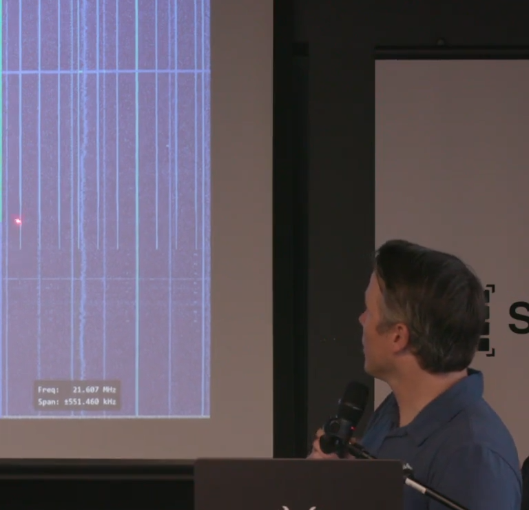 Nick Foster opens the talk by discussing how the first job is often to figure out what you’re seeing when you pick up a radio transmission. “The moral of this talk is that your hardware is always lying to you,” says Nick. “In this talk, we’re going to show you how your radio lies to you, what you can do about it, and if your hardware is not lying to you, what is that real station that you’re looking at?” It can be difficult to tease out the truth of what the radio might seem to be picking up. “How do we determine what a signal actually is?” he asks. “Is it a real signal that we’re looking at which is being transmitted deliberately from somebody else, or is it interference from a bad power supply, or is it a birdie—a signal that’s created entirely within my own radio that doesn’t exist at all?”