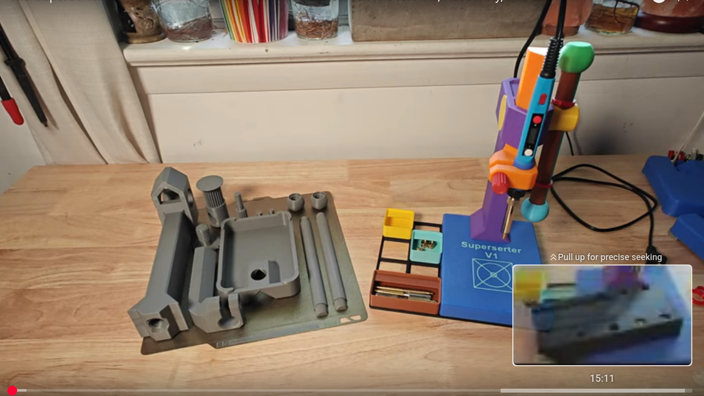 He calls it the Superserter. Not only is it 100% printed plastic, but the entire design fits on a single 256 mm by 256 mm bed. In his case it was done on the Bambulab X1C, but it’s a common enough print bed size and can be printed without any supports. It’s even sized to fit the popular Gridfinity standard for a neat and tidy desk and handy bin placement for the inserts.