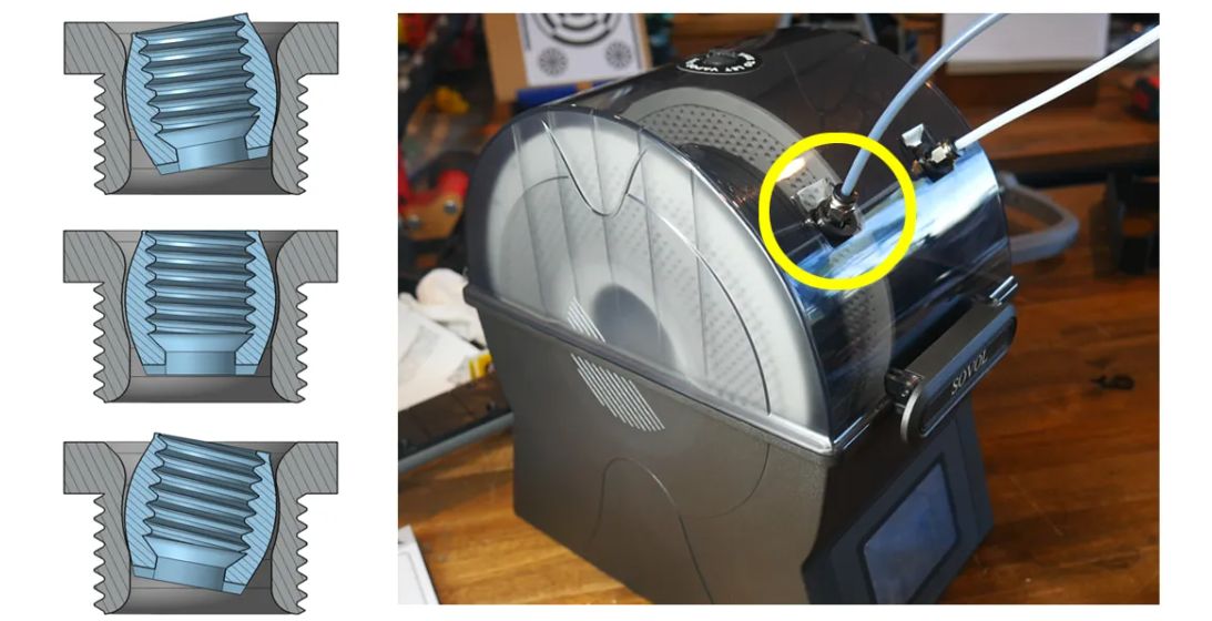 Many FDM filament dryers have a port through which you can guide the filament. This handy feature allows you to print from the spool without removing it from the dryer, saving time and limiting exposure to (moist) air. Unfortunately, these exit ports aren’t always thought out very well, mostly in terms of the angle with the spool as it unrolls. The resulting highly oblique orientation means a lot of friction of the filament on the side of the port. This issue is addressed in a recent [Teaching Tech] video, with a simple, low-cost solution.