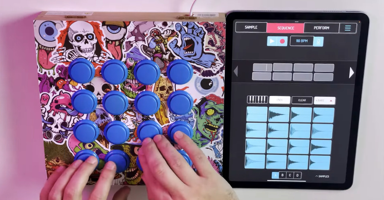 The MIDI controller itself is quite fetching. It’s built with a 4 x 4 array of arcade buttons to act as triggers for MIDI notes or events. They’re assembled in a nice wooden case with a lovely graphic wrap on it. The buttons themselves are wired to a microcontroller, which is then responsible for sending MIDI data to other devices.