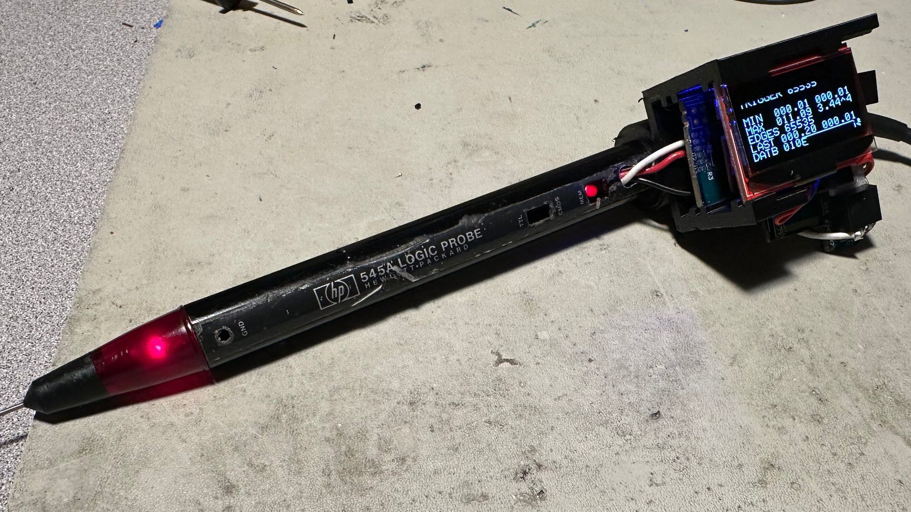 [Robert Morrison] had an ancient HP 545A logic probe, which was great for debugging SMT projects. The only problem was that being 45 years old, it wasn’t quite up to scratch when it came to debugging today’s faster circuitry. Thus, he hacked it to do better, and entered it in our 2025 One Hertz Challenge to boot!
