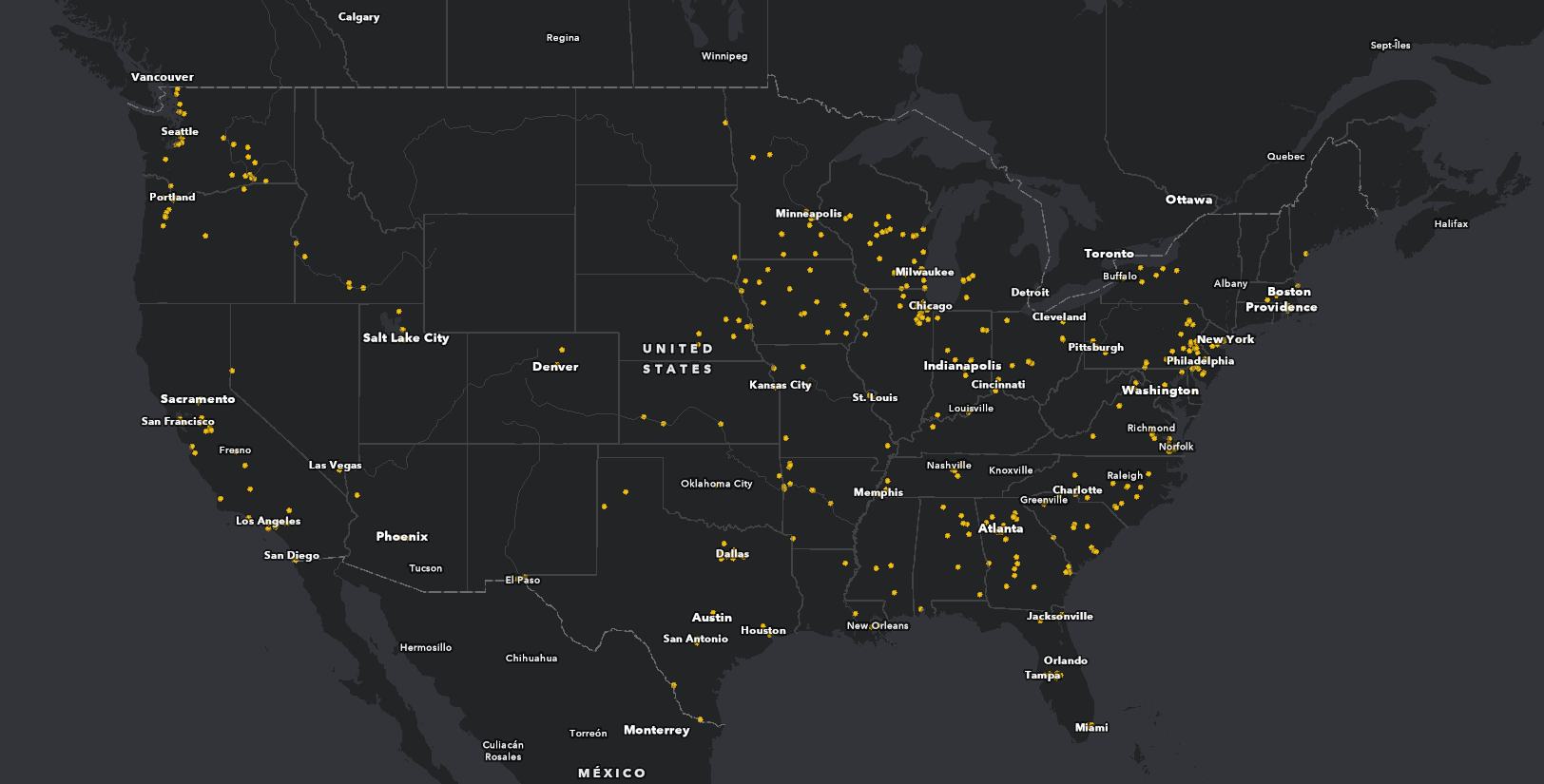 Due to the nature of their business, location is critical to PRWs. They have to be close to where the food is produced as well as handy to transportation hubs, which means you’ve probably seen one of these behemoth buildings from a highway and not even known it. The map above highlights the main agricultural regions of the United States, such as the fruit and vegetable producers in the Central Valley of California and the Willamette Valley in Oregon, meat packing plants in the Upper Midwest, the hog and chicken producers in the South, and seafood producers along both coasts. It also shows a couple of areas with no PRWs, which are areas where agriculture is limited to cereal grains, which don’t require refrigeration after harvest, and livestock, which are usually shipped for slaughter somewhere other than where they were raised.