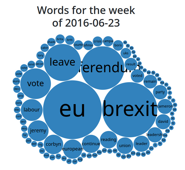A bubble cloud for the week of 2016-06-23, when the UK Brexit referendum happened. Big words are EU, Brexit,referendum, leave, and vote.