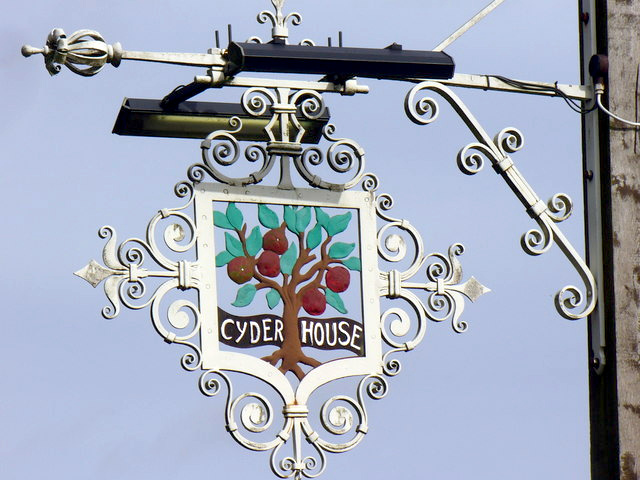 A hanging sign surrounded by ornate metalwork, with the legend "Cyder house".