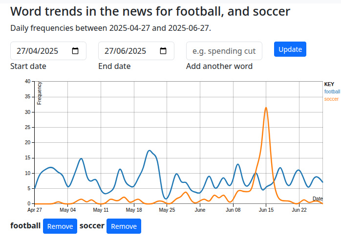 A graph of the word football versus the word soccer in British news.