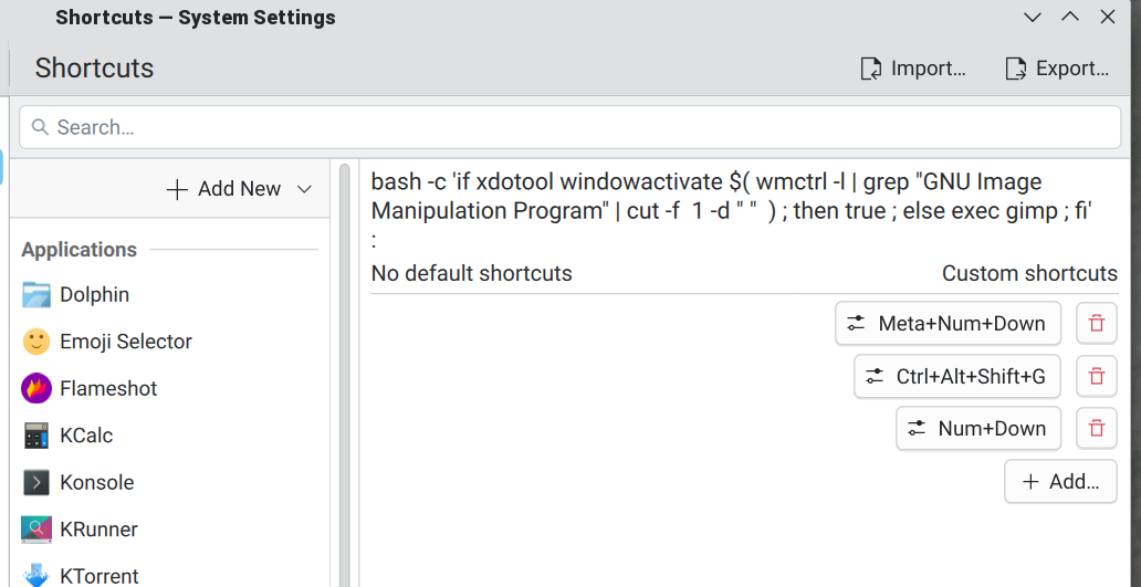 But the macropad doesn’t care. So I set up the first key to be Control+Alt+Shift+A, followed by Control+Alt+Shift+B, and so on. Now, I can easily use the KDE keyboard shortcuts from the control panel to catch those keys and do things like launch a shell, change desktops, or whatever.