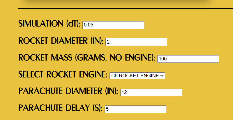 The calculator lets you key in the fundamentals of your hobby rocket. Punch in the diameter of your rocket, its mass, the standard rocket engine you’re using, and the diameter and delay time of your parachute, and it will chart the altitude profile expected during flight.