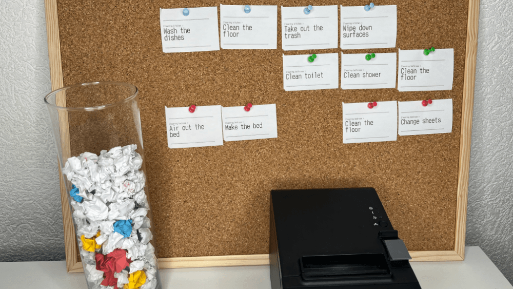 That’s where the post-it notes came in. Post-its went up on a board with all of his tasks for the day; the input was his completing the tasks, and the feedback was taking them down, crumpling them up, and putting them into a clear jar that would serve as a score bar for his productivity. The feedback actually rewarded multiple senses this way: the tactility of crumpling paper, the sound of it, and the visual of the rising level of the jar.