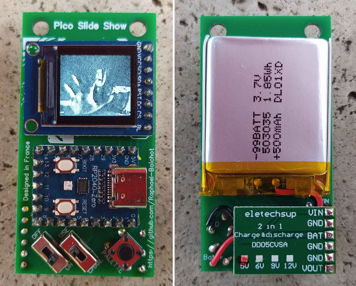 While we cannot be certain this is the world’s smallest digital photo frame, [Raphaël Boichot]’s Pico Slide Show is probably in the running. Since the 0.85″ TFT display would be wasted on multi-megapixel images, [Raphael] has dedicated this project to images from the Game Boy Camera.