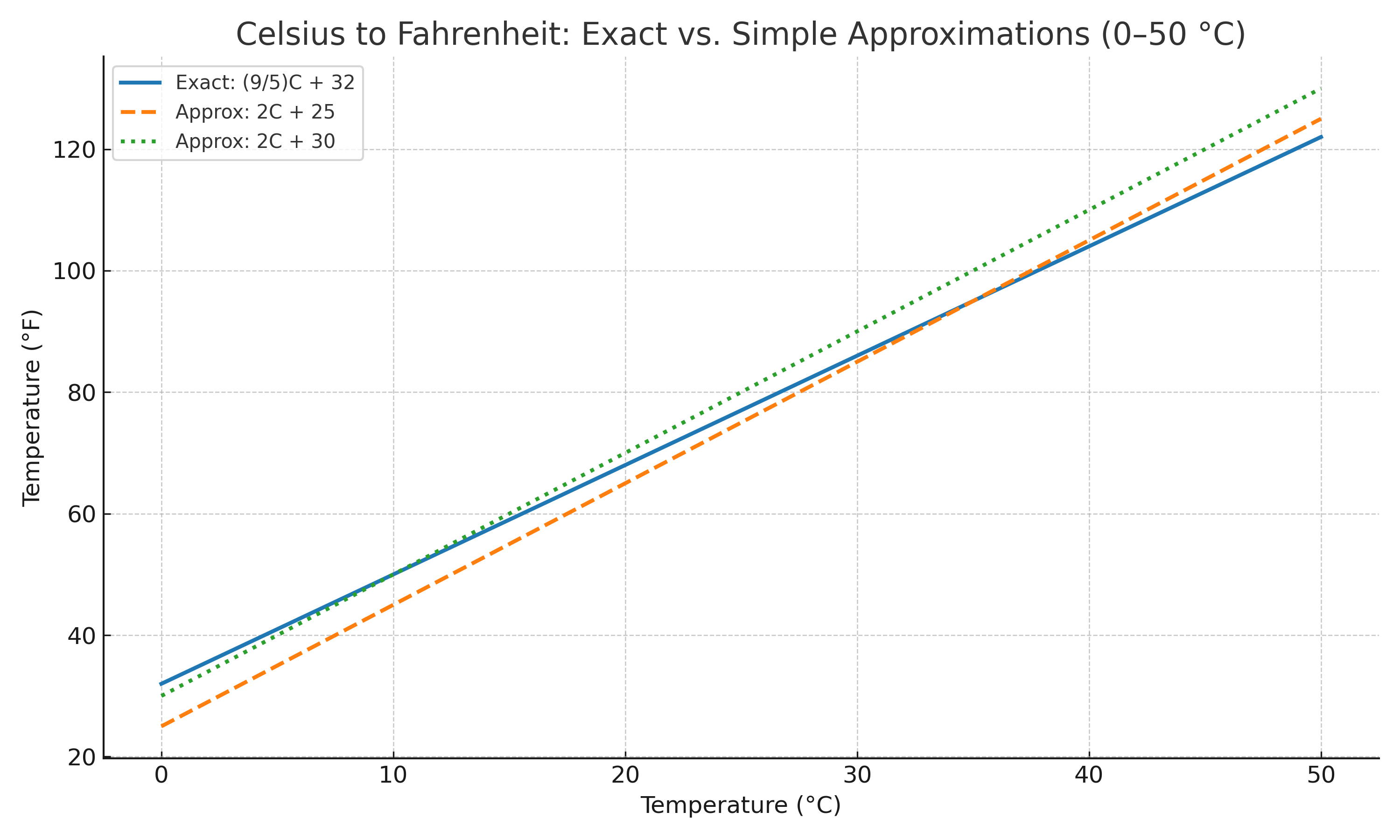 Most of us can’t multiply by 9/5 in our heads. But 9/5 is very nearly two. So if you double the Celsius temperature, you are halfway there. Of course, the number will be too high. But to make up for it, instead of adding 32, just add 30. For weather temperatures, this gives you a ballpark estimate. For 0 °C, you get 30 °F instead of 32. For 20 °C, you get 70 °F instead of 68. For 35 °C, you get 100 °F instead of 95. All close enough.