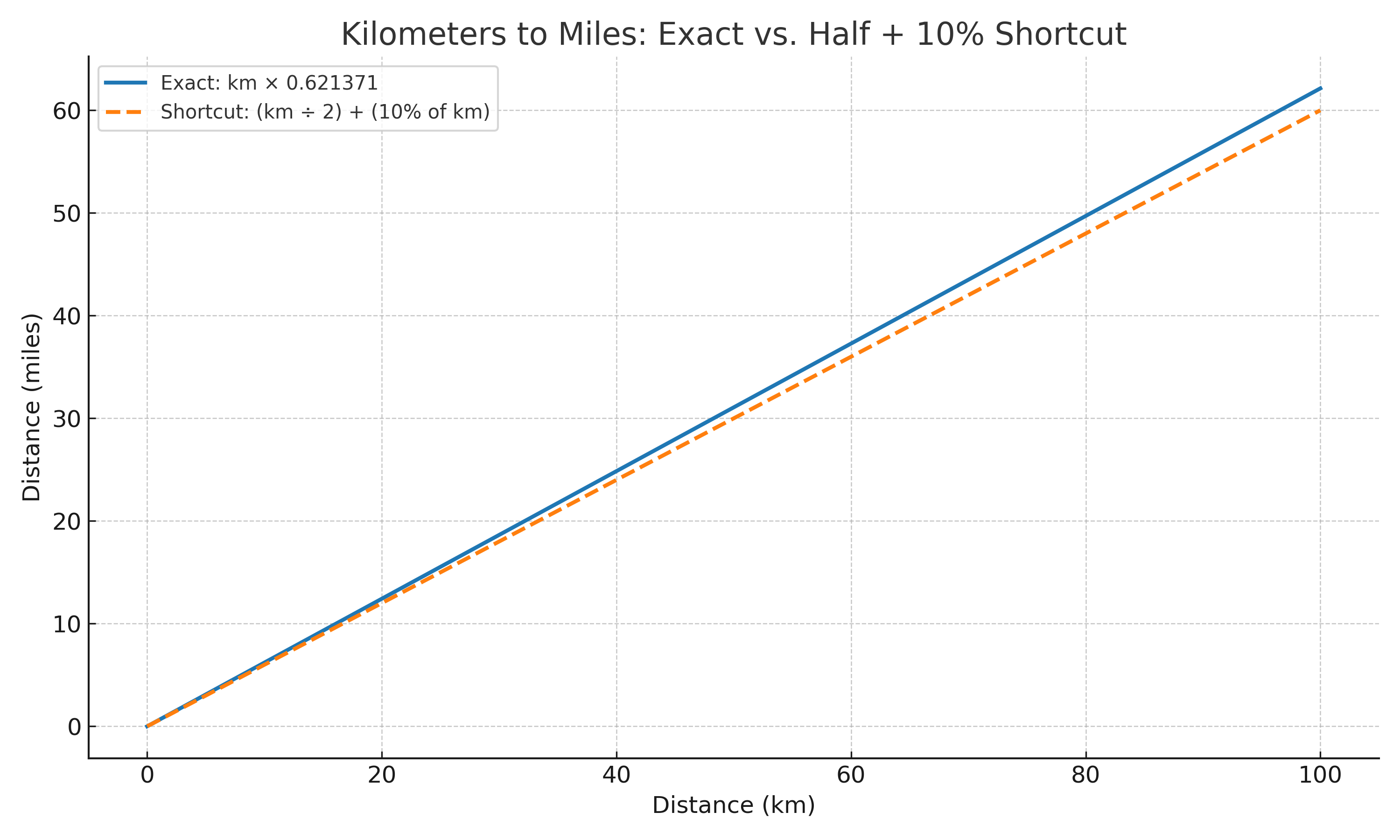 The factor for kilometers is roughly 0.6 miles in a kilometer or 1.6 km/mile. If you halve the kilometers, that will get you a fairly low estimate. So 35 km (21.7 miles) is easy to guess as more than 17.5 miles. That’s a pretty big difference, though. But if you then add 10% of the 35 back (3.5) you get 21 miles which is close.