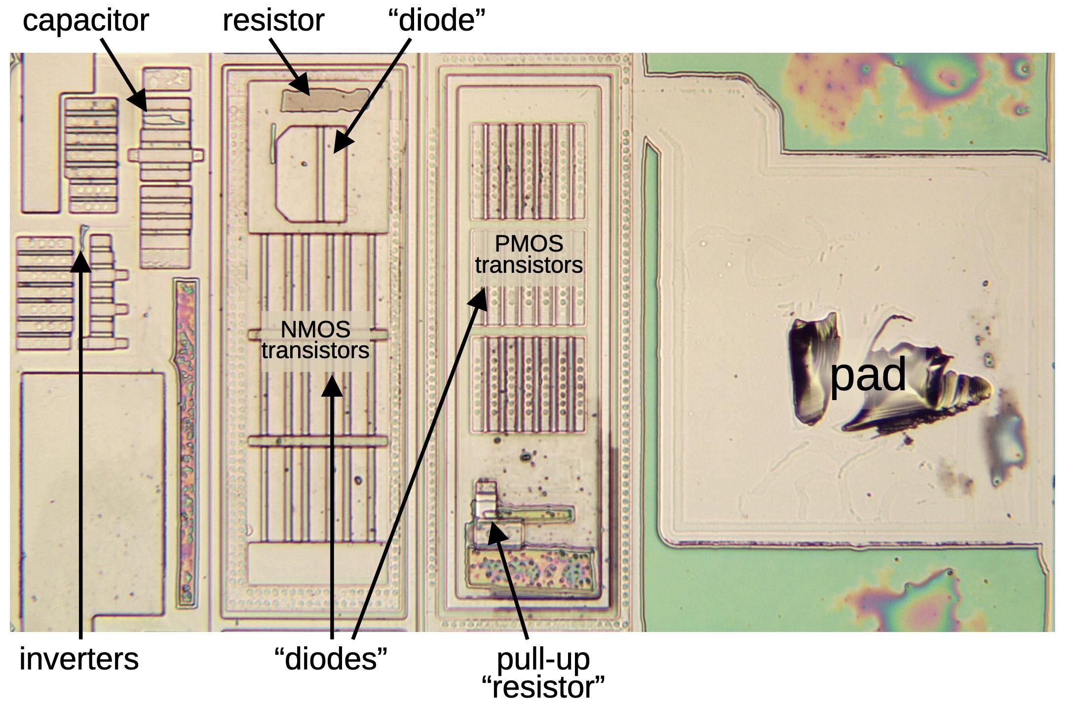 The 386 has a total of 141 of these I/O pads, each connected to a pin on the packaging with a delicate golden bond wire. ESD is on the top of the list of potential risks, as a surge of high voltage can literally blow a hole in the circuitry. The protective circuit for this can be seen in the above die shot, with its clamping diodes, current-limiting resistor and a third diode.