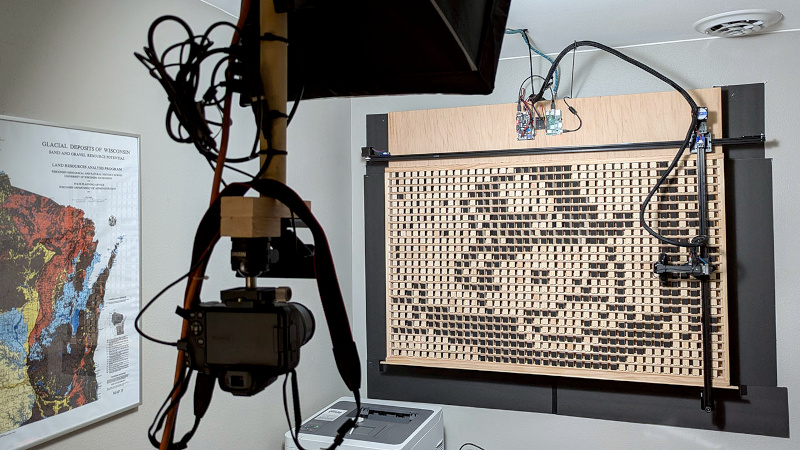 It’s a kilopixel display because it has a resolution of 40 by 25 pixels, and it takes the form of a rack of wooden cubes, each of which can be turned by a tool on a gantry to expose either a black or a white side. It’s very slow indeed — he has an over nine hour long video of it in operation — but it is an effective device.