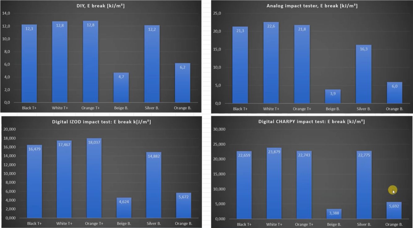 According to Bambu Lab’s claims for the filament, it’s supposed to have ‘up to’ double the layer adhesion strength as their basic PLA, while being much more robust when it comes to flexing and ‘taking a beating’. Yet as [Igor] goes through his battery of tests – comparing PLA Tough+ against the basic PLA – the supposedly tough filament is significantly worse in every count. That sad streak lasts until the impact tests, which is where we see a curious set of results – as shown above – as well as [Igor]’s new set of impact testing toys being put through their paces.