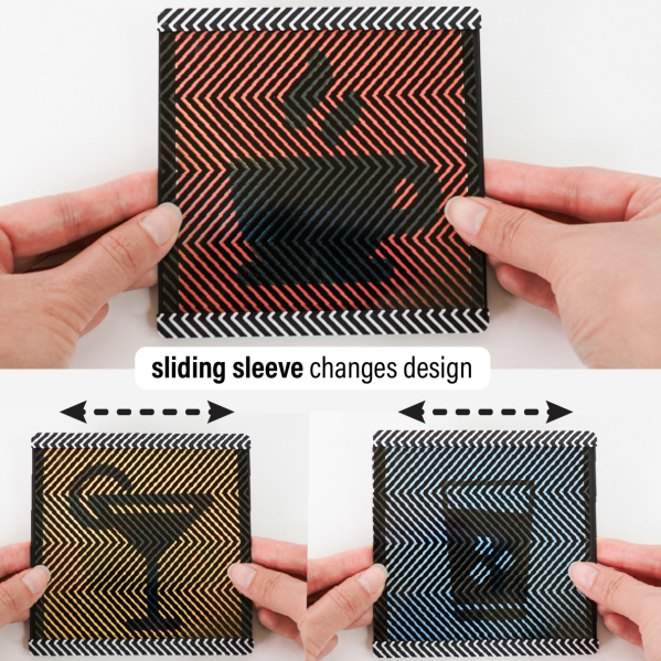 The paper (PDF) has more details, and while it is possible to make highly complex animations with this system, the more frames and the more complex the design, the more prominent the barrier grid and therefore the harder it is to see what’s going on. Still, there are some very nice results, such as the example in the image up top, which shows a coaster that can represent three different drink orders.