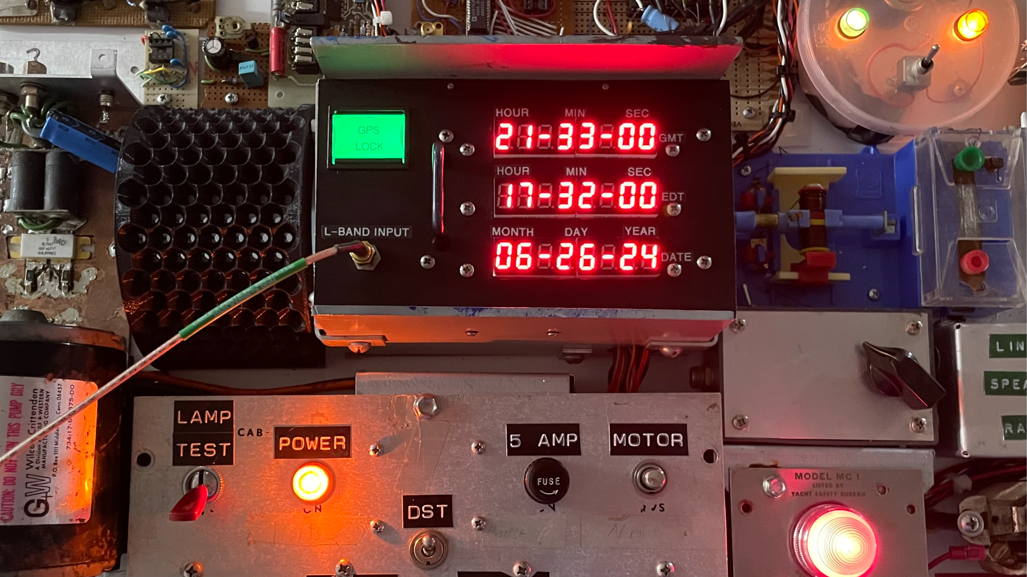 As mentioned, the whole panel is more than just a collage of vintage hardware — it functions as a digital clock, complete with seven-segment LED displays and a sheet metal panel festooned with salvaged controls. Behind it all, an Arduino MEGA takes care of running the show.