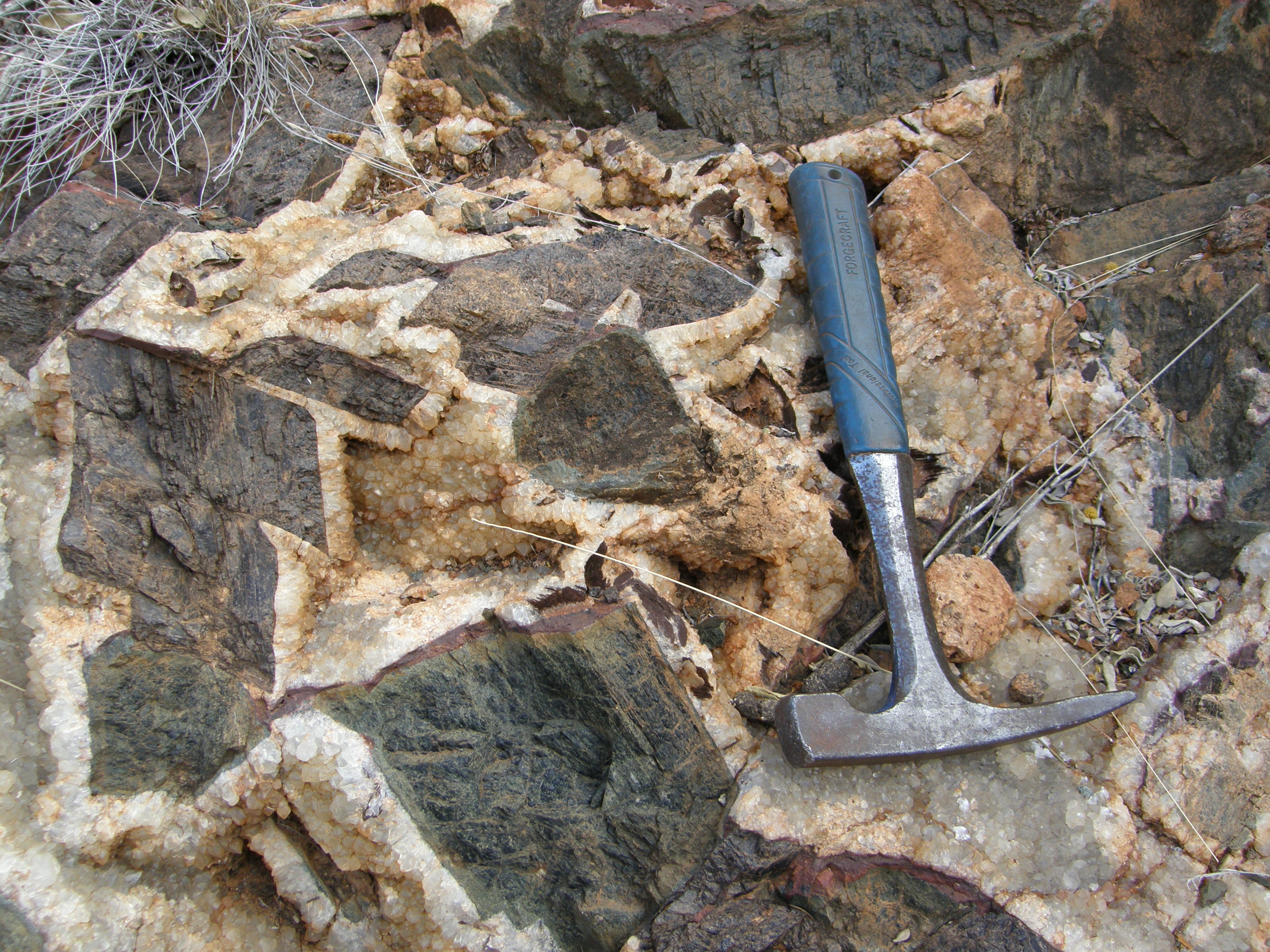 When you’re using your hammer for scale next to the crystals, you know it’s a pegmatite. This example is from Radium Creek, Arkaroola, South Australia. Image: Geomartin, CC-BY-SA 4.0